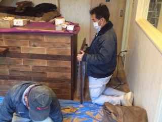 一枚一枚丁寧にカウンター側面に板を貼っています。レトロな …