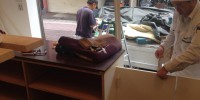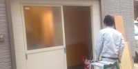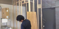 店舗工事のカウンターと商品棚、スウィングドアの設置をやっ …