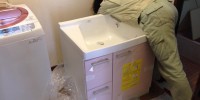 昨日、クロスとCFを貼って、今日、洗面化粧台を取り付けて …