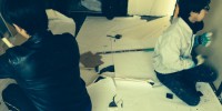 天井を和式の式目天井から洋室仕様に変えるので天井の石膏ボード貼りとクロス工事を行っています。