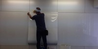 オフィスのパーテーションのパネルにホワイトボードシートを …